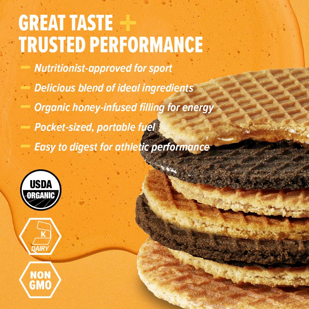 For years, similar waffles have been sold on street corners throughout Europe and eaten by professional cyclists, so we decided to create our own by sandwiching honey between two thin waffles. Honey Stinger Waffles are easy to digest, certified organic and available in a single-serving wrapper.